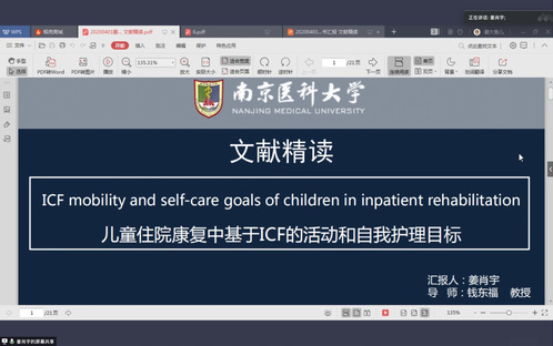 为进一步提升研究生阅读能力,夯实理论基础,4月1日晚18点,护理人文与管理学系积极开展研究生线上读书报告会。本次读书报告会由张弛同学主持,学系钱东福、姚俊、樊宏、嵇艳等研究生导师和全体研究生参加了会议。