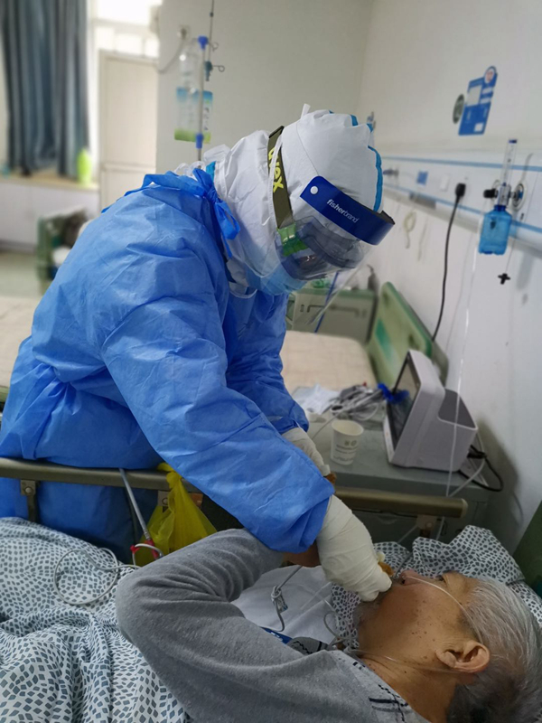 到达黄石市中医院后,李洁进入了患者病情较为严重的呼吸科工作,这个被大家称为“小ICU”的地方,医护人员工作量同样很大。第一个晚班,李洁是在半污染区工作,需要时刻关注隔离病房内的病人呼叫铃,常常是一手拿着对讲机,一手拿着工作手机,做医生和隔离病房护理人员的桥梁。一方面要将隔离病房里患者的突发情况汇报给医生,另一方面,要及时转诉医生的处理方式给隔离病房里的同事。与此同时,李洁还承担着配置药品、每2个小时记录患者生命体征、向医生汇报病情、与后勤保障紧急联系解决病区的设施故障、接听患者家属电话、与家属沟通等工作。