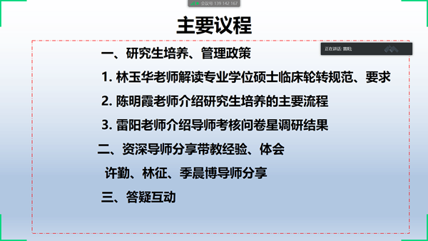 会议第二个议题,请到三位经验丰富的研究生导师:许勤院长,林征主任,季晨博主任分享自己在研究生指导过程中的思考和体会。许院长指出,必须明确导师是研究生的第一责任人,端正学风、立德树人、加强管理是导师应承担的重要责任。在建立固定的学术联系的基础上,也需要关注学生的身心健康成长,亦师亦友。林主任从传道授业解惑三个角度分享了她对于研究生导师这个角色的理解,她强调,导师要培养德才兼备的好学生,做事情要踏实,做学问不浮躁,研究生阶段不仅是一个学习的过程,也是一个丰富经历的过程,更是一朵云彩推动另一朵云彩,一个灵魂唤醒另一个灵魂的过程。季主任主要就如何全方面的启发学生,以解决问题为导向,设计因材施教的培养方法分享了自己的经验。