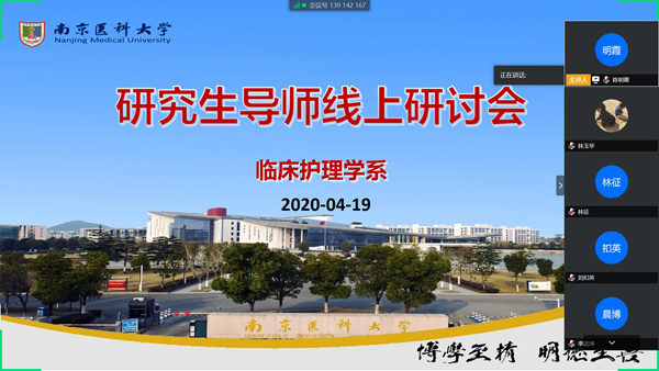 为了响应学校关于研究生导师聘期考核工作的文件精神,落实MK体育(中国)关于开展2019年研究生导师聘期考核工作的具体方案,临床护理学系于4月19日开展了研究生导师线上研讨会,会议由陈明霞主任主持,临床护理学系的14位研究生导师,及教研办林玉华主任参加了会议。