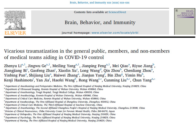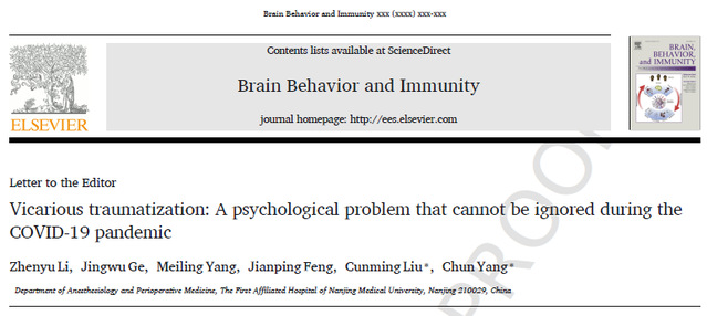 热烈祝贺南京医科大学第一附属医院护理团队新冠类文章“Vicarious traumatization in the general public, members, and non-members of medical teams aiding in COVID-19 control”于2020年3月发表于 《Brain Behavior and Immunity》(IF = 6.17)。该原创性文章报道了新冠疫情爆发期间一线和非一线护理人员以及普通大众的替代性创伤这一心理障碍的现况。该文发表后短短一个半月已被引用44次,并收到约20封国外学者邮件咨询。针对读者来信,研究团队于《Brain Behavior and Immunity》同刊发表了correspondence文章“Vicarious traumatization: A psychological problem that cannot be ignored during the COVID-19 pandemic”作为回应。