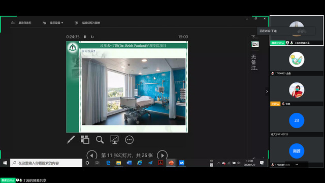 丁涛老师简要介绍了项目的相关内容:德国的地理位置、创始人埃里希·宝隆的生平以及德国护理教育体系、教育理念、就业前景、实习环境。他还提到德国特有的“双轨制职业教育”,即通过理论与实践的结合使学生得到更好的锻炼,使同学们更加深入地了解德国护理教育与国内护理教育的差别。