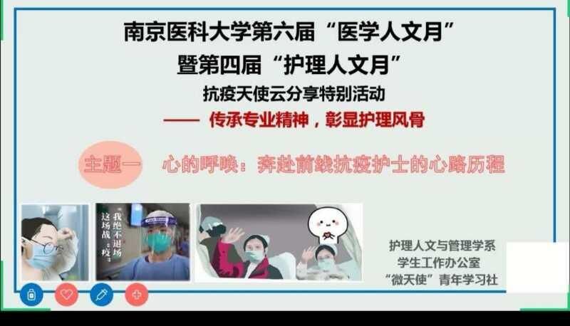 为响应学校“共抗疫情,爱国力行”主题教育活动,分享抗疫先进、典型事例,弘扬爱国主义和护理专业精神,MK体育(中国)以“传承专业精神,彰显护理风骨”为主题,开展第四届“护理人文月”抗击新冠肺炎疫情特别活动。4月28日晚7点,学院邀请江苏省人民医院普外结直肠病区护士长姚翠,江苏省人民医院主管护师陶鹏飞,进行第一次“云分享”。活动前期,同学们积极报名,最后有近280位同学参与了分享活动。参加分享会的老师有MK体育(中国)嵇艳老师、朱军华老师。分享会由嵇艳老师主持。