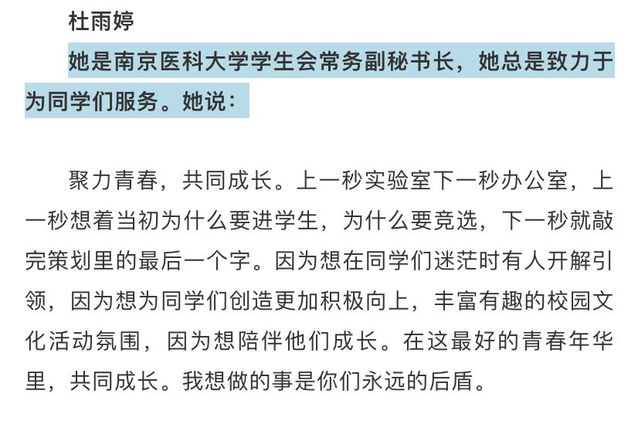 杜雨婷的奉献精神早在学生时代就埋下了伏笔,她曾担任南京医科大学学生会常务副秘书长一职。