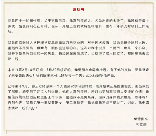 “我是mk体育在线官网急危重症方向毕业的,我想为疫情防控尽一份力。”祁佳丽不死心,随后多次向医院请缨出征,并写下请战书,以行动捍卫医者最初的誓言。