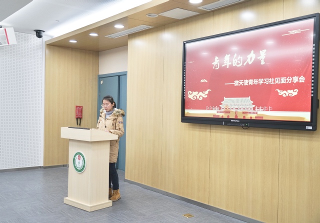 会议伊始,先由副社长石雨婷发言,她简单讲述了召开此次分享会的主要目的:注重与贯彻落实党的十九大精神相结合、与学习宣传贯彻团的十八大精神结合、与提升青少年思想文化素养相结合。随后,由社团的青年代表杨盛润发言,他讲述了他对社会主义核心价值观的认知以及他对当代青年行为及思想的合理建议。
