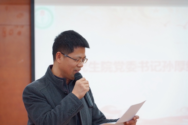表彰大会后,研究生院党委书记孙厚纯老师发表讲话。首先他代表研究生院党委对老师和同学们表示感谢和热烈的祝贺。接着他引用习近平总书记的语录号召同学们要始终牢记习近平总书记的殷切希望,要坚持学以致用,用实际行动报效祖国,服务社会,服务人民,更不要忘记当初学医的初心和神圣的使命。深入基层、深入群众,在改革开放和社会主义现代化建设的大熔炉中,在社会的大学校里,掌握真才实学,增益其所不能,努力成为可堪大用、能担重任的栋梁之材。同时还要求同学们修身立德,加强道德修养,陶冶政治情操,艰苦奋斗,努力提高创新能力。