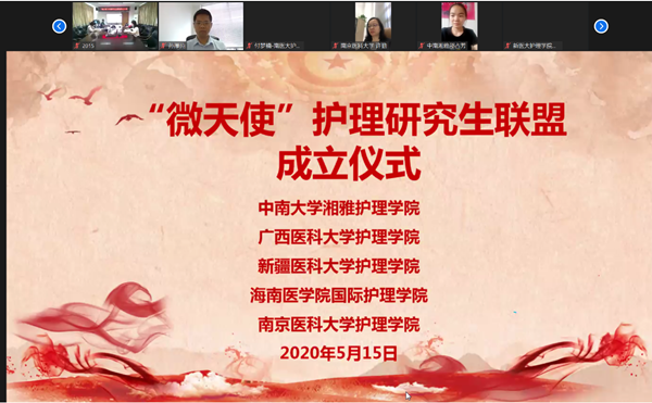 五月春风易暖,花海溢香,2020年5月15日,由中南大学、广西医科大学、新疆医科大学、海南医学院、南京医科大学五所院校的MK体育(中国)共同发起的“微天使”护理研究生联盟(以下简称联盟)云成立仪式如期举行。