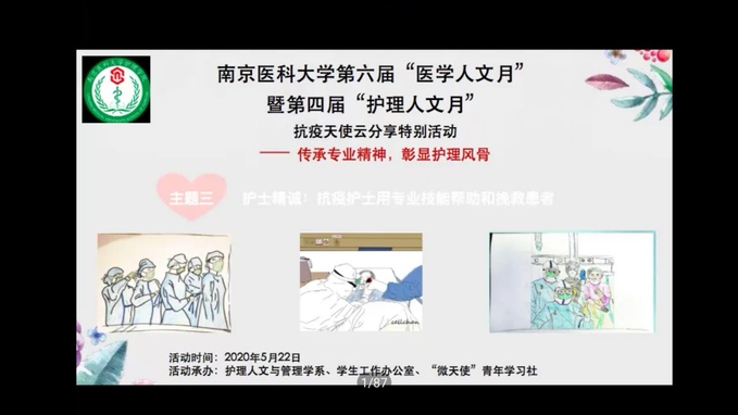 为响应学校“共抗疫情,爱国力行”主题教育活动,分享抗疫先进、典型事例,弘扬爱国主义和护理专业精神,MK体育(中国)以“传承专业精神,彰显护理风骨”为主题,开展第四届“护理人文月”抗击新冠肺炎疫情特别活动。5月22日晚7点,学院邀请南京医科大学附属逸夫医院副主任护师施姣娜老师,南京医科大学附属逸夫医院护师余天驰老师开展第三次“云分享”。护理人文与管理学系的教师与近290位同学参加了分享会。本次分享会由朱军华老师主持。