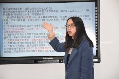 活动伊始,邢颖学姐向同学们介绍了进入保研初试的条件,要求参加初试的同学们绩点在专业内排名前1/4,至少获得过一次三等奖以上奖学金,通过计算机二级和英语六级426分及以上。如果另有同学想破格进入初试,则需参加重大竞赛获奖或者在中文核心期刊、SCI学术期刊上发表论文,或是获得医学类发明专利并获省级以上奖励,再由三名以上本校专家联名推荐。之后,邢颖学姐建议同学们言行要大方,提高自己的专业知识和科研素养,注意外语水平的提高,同时注重提升综合素质。