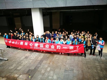 室内游戏结束后,参赛队伍在志愿者统一带领下,步行至体育馆进行室外的两项活动,包括疯狂象棋、导盲寻宝。而在活动进行至最后一个环节导盲寻宝活动时,天气突变,下起小雨,但参赛队员兴致高昂,仍坚持游戏继续进行。最后,参赛人员集体合影留念,活动顺利结束。