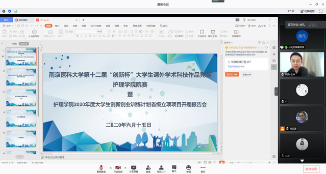 6月15日下午,南京医科大学第十二届“创新杯”大学生课外学术科技作品竞赛MK体育(中国)院赛(以下简称为“创新杯”MK体育(中国)院赛)暨MK体育(中国)2020年度大学生创新创业训练计划(以下简称为大创)省级立项项目开题报告通过腾讯会议平台顺利召开。出席本次会议的有校团委副书记王铭泽老师、校团委庄林老师、MK体育(中国)基础与社区护理学系周玉峰和李现文教授、护理人文与管理学系嵇艳教授、护理研究中心季明辉博士、护理学实验教学示范中心丁晓彤老师、MK体育(中国)学生工作办公室付梦楠老师以及各参赛项目组成员。