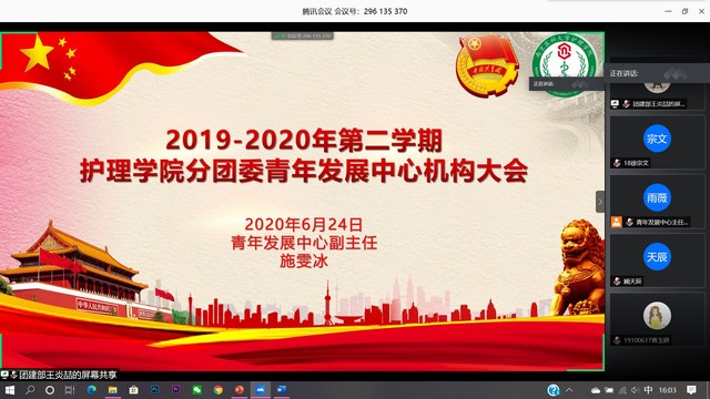2019-2020学年第二学期mk体育在线官网分团委青年发展中心机构大会于6月24日下午四点在腾讯会议上如期举行。MK体育(中国)分团委书记兼青年发展中心指导老师付梦楠老师,青年发展中心主任张雨薇、团建部部长周诗宇、组织部部长顾涟琦、科创部部长徐凡、外联部部长徐琛以及全体青年发展中心成员参加了会议,会议由青年发展中心副主任施雯冰主持。