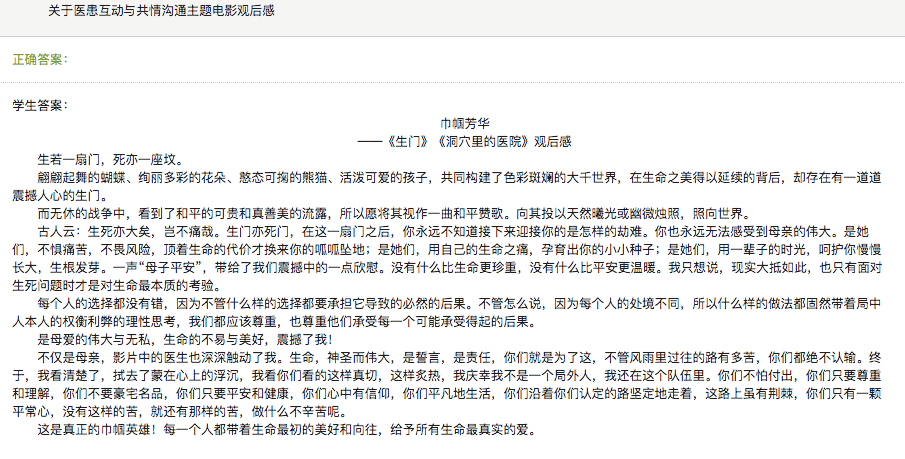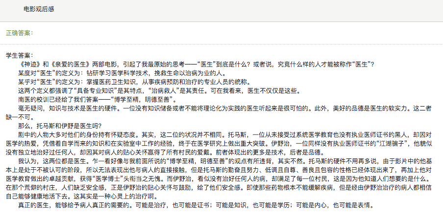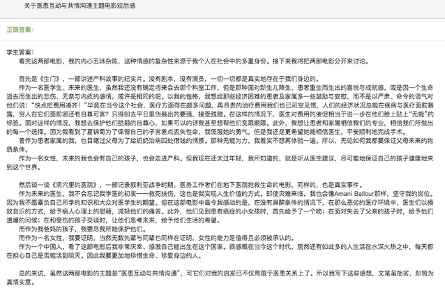 该课程经过前期精心设计,以医患互动与共情沟通、生命教育与死亡关怀、职业精神与人生幸福三个主题作为主线,先后共同赏析纪录片《生门》、电影《洞穴里的医生》、《姐姐的守护》《雨中请求》、《神迹》和《亲爱的医生》。为了更深入地去探索纪录片和电影的精髓与灵魂,感受医学人文的本质,参与授课的三位老师,在每一个主题结束后,通过QQ会议形式,引导同学们针对电影的主要内容进行讨论以及对相应主题进行延伸反思,并让同学们提交相关主题的观后感。