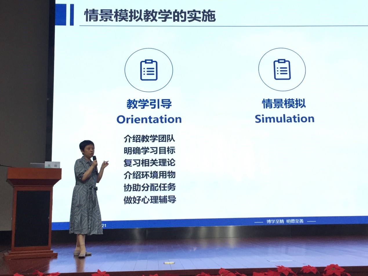 外科护理学课程负责人张俊老师结合“心脏骤停患者抢救的模拟教学”案例,生动展示了《情景模拟教学的课堂实施》过程,讲解了教学引导、情景模拟和引导性反馈每个环节的具体细节。最后,以一个短片向老师们传递了一个重要信息:在吴阶平医学基金会模拟医学部护理学专家委员会的大力推进下,我国护理模拟教学将蓬勃发展,并日趋规范化、标准化,最终走向国际化。