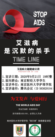 为提高青年大学生对艾滋病知识的认识,正视艾滋病问题,消除对艾滋病患者的歧视,关注艾滋病相关弱势群体,增强自我保护意识,降低感染艾滋病患的危险性,促进自我积极预防和治疗措施的实施,南医“微天使”微健康宣讲团及时行动,将于2020年9月21日19时整于腾讯会议(会议ID:563628104)对南京财经大学学生进行艾滋病主题健康宣讲活动,同时将此次宣讲进行录播后上传微天使公众号供我校学生自主学习。