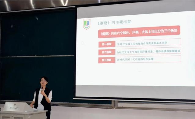 课程开始,管书记首先从制订背景、核心内容和如何加强新时代爱国主义教育三个方面详细解读了党中央和国务院印发的《新时代爱国主义教育实施纲要》内容。管书记称:“爱国主义是中华民族的民族心、民族魂,是中华民族最重要的精神财富;作为学生干部的大家一定要做好其他学生思想的引领者,承担起时代的重任!”。她提到,青少年是爱国主义教育的重中之重,要将爱国主义精神贯穿于学校教育全过程,推动爱国主义教育进课堂、进头脑,充分发挥课堂教学的主渠道作用。