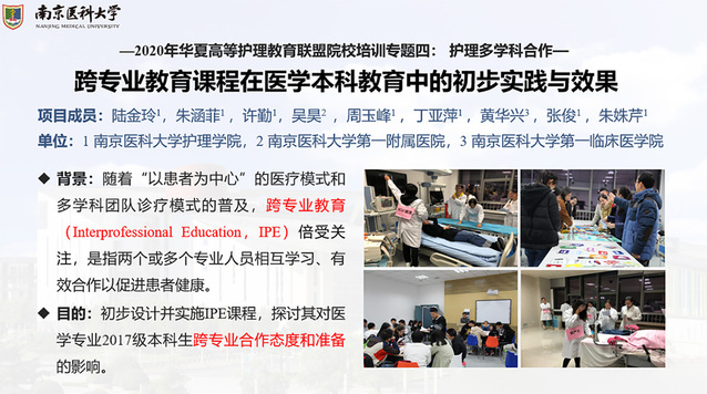 我院遴选了两项创新护理项目的团队代表参加了此次培训。《跨专业教育课程在医学本科教育中的初步实践与效果》项目由mk体育在线官网许勤教授和南京医科大学第一附属医院急诊科吴昊副主任共同指导,2018级研究生陆金玲、朱涵菲合作参与。《基于HAPA与TPB的乳腺癌患者术后上肢功能锻炼行为模型构建》项目由南京医科大学尤华副教授和南京医科大学附属肿瘤医院乳腺外科程芳副主任护师共同指导,2019级研究生张弛、陆宁宁合作参与。在参会师生专题研讨环节,分别在“护理多学科合作”、“护理评判性思维培养”分论坛进行口头汇报。