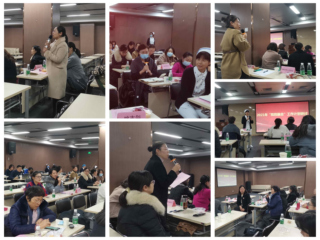 在2021年“院院融合”工作计划研讨环节,附属淮安第一医院张青主任、第二附属医院褚志平主任、附属脑科医院钱瑞莲主任、儿童医院护理部副主任彭明琦、其他附属医院的代表们也分享各自单位在“院院融合”中的收获和新一年的设想规划,多家医院也表达了对临床科研能力培养的需求。