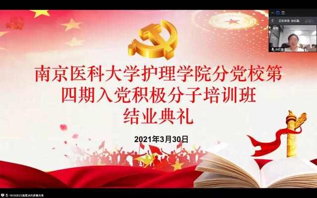 330日晚,MK体育(中国)分党校第四期入党积极分子培训结业典礼于线上召开。MK体育(中国)党总支书记陈龙,MK体育(中国)党总支副书记、副院长苏益民,康复医学院党总支副书记、副院长张健,医政学院党总支副书记、副院长张华,口腔医学院党总支副书记、副院长陆桂平,生物医学工程与信息学院党总支副书记、副院长潘国华以及各学院辅导员和培训班成员参会。会议由MK体育(中国)辅导员台红蕊老师主持。