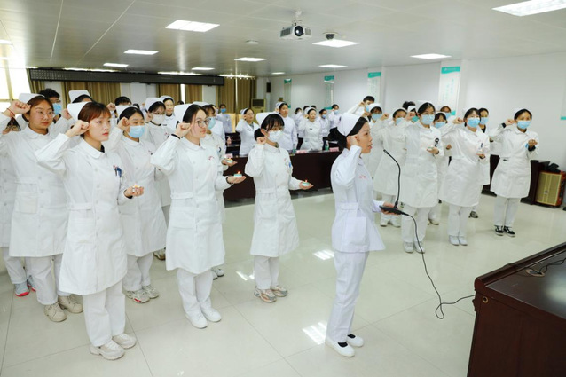 随后,在班主任刘彦梅老师的带领下,全体护理人员面对南丁格尔像庄严宣誓,并表示不忘今天的决心和誓言,热爱专业,勤勉好学,忠于职守,兢兢业业,将毕生精力奉献给护理事业。