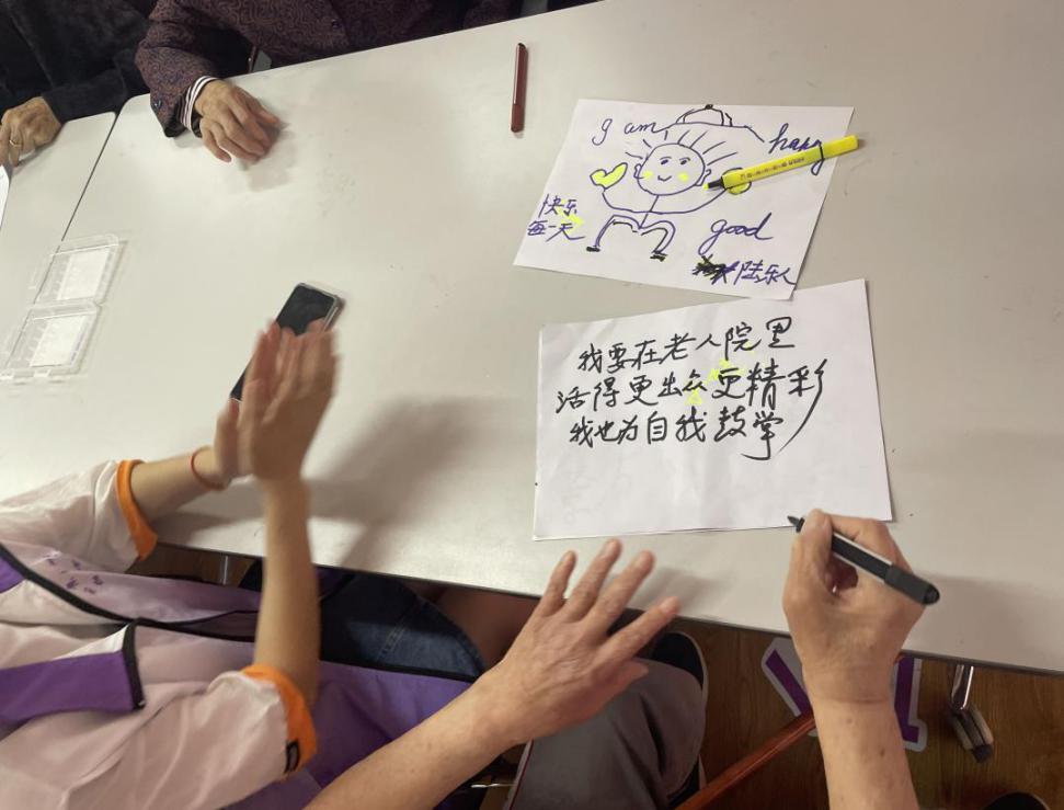 现场的陆伟群老人说:“快乐对于老人来说是很重要的,快快乐乐地一天才会过的很顺利。”独特而乐观的老人在纸上写下“我要在老人院里活得更出众更精彩,我也为自我鼓掌。”