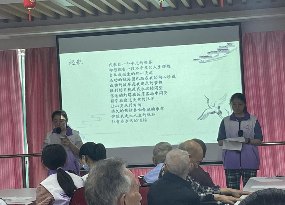团体活动结束后,由任绪睿、吴婷两位同学为老人们带来了朗诵《起航》,“我来自平凡的世界,却想拥有一段不平凡的人生辉煌…”。用深情的朗诵为老人们带来关怀。