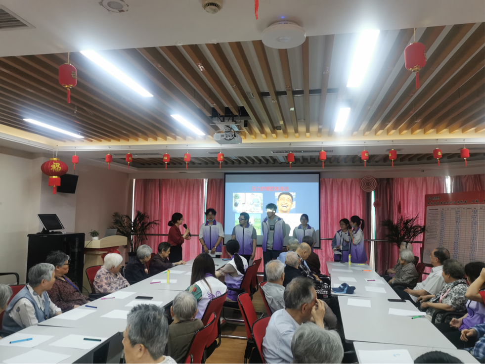 孟瑶博士带领老人们进行压力舒缓团体活动,分享心理健康小知识,讲述压力和情绪如何影响心理健康以及如何保护心理健康。孟老师邀请六名志愿者参加“表情猜猜猜”的活动,通过志愿者与老人的互动,为现场的老人解压。