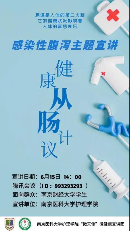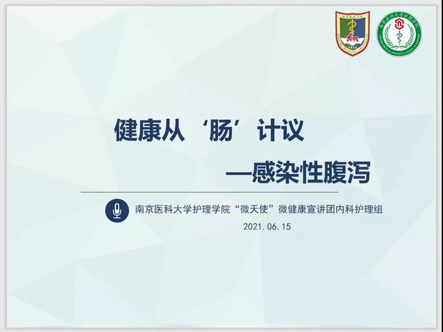 6月15日下午,“南医微天使”微健康宣讲团内科护理组以腾讯会议形式面向南京财经大学经济学院2019级、2020级研究生及部分本科学生共40人开展了“健康从‘肠’计议——感染性腹泻”主题健康宣讲。宣讲内容包括感染性腹泻基本知识、如何预防感染性腹泻、如何处理感染性腹泻等。宣讲团成员徐迪、刘赟玥两位同学主讲。