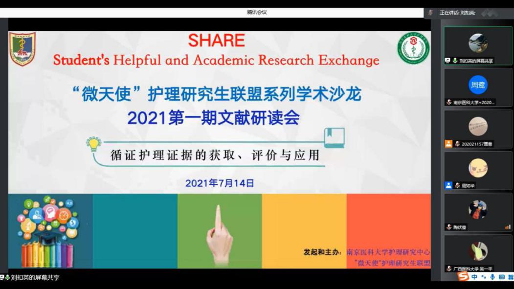 7月14日下午2:00,由MK体育(中国)发起和主办的“微天使”护理研究生联盟系列学术沙龙2021第一期文献研读会在线准时召开。该系列学术沙龙拟每学期举行一次,围绕护理科研实践中的重要问题开展文献研读。文献检索与发现问题科学研究的起点,因此本次第一期分享与交流主题为“循证护理证据的获取、评价与应用”。