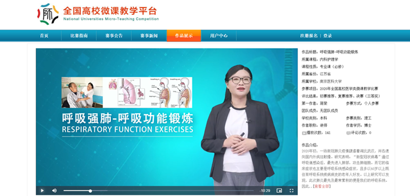 蒋荣老师的作品《呼吸强肺-呼吸功能锻炼》荣获三等奖,该作品以新冠肺炎患者呼吸功能的恢复为切入点,以临床常见的呼吸系统疾病-慢性阻塞性肺疾病(COPD)为例介绍了呼吸功能锻炼方式的相关知识点。课程中采用讲授法、动画演示法、讨论法、互动提问法等帮助学生更为深入、直观地理解COPD患者康复治疗时的正确呼吸功能锻炼方法及原理。在带领同学们亲身演练的过程中,融入以人为本的医学人文理念。