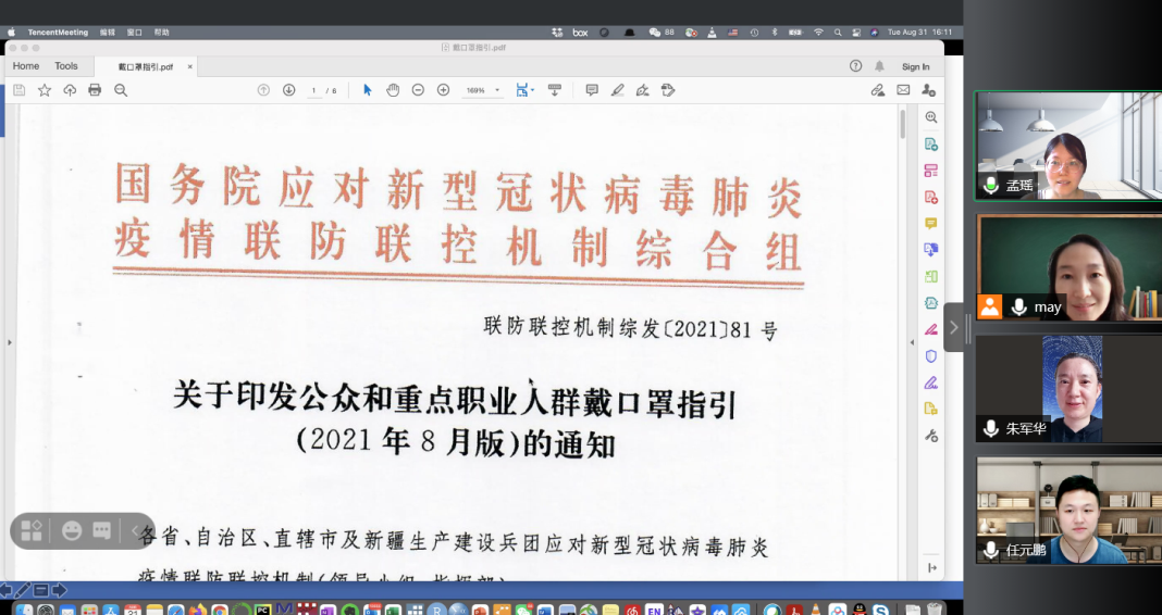 2021年9月1日上午,学系通过腾讯视频召开了视频会议,学习了国家卫生健康委员会办公厅下发的新冠病毒期间关于重点职业人群戴口罩指引文件。会议由杨如美主任主持,学系全体老师参加了会议。