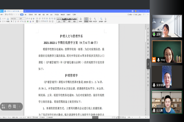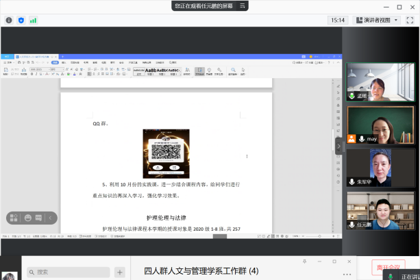 会议探讨了学系新学期的各项教学安排,尤其是两门本科生课程《护理管理学》和《护理伦理与法律》的教学计划安排。根据学校教务处通知,按照学院统一部署,为应对疫情防控,提前做好在线教学方案的准备,两门课程的负责人分别就教学计划特别是开学后前4周的在线教学计划做了详细汇报,汇报内容主要包括课程的授课方式、超星学习通平台的使用、增加QQ群等师生互动渠道以及开展本课程集体备课等。