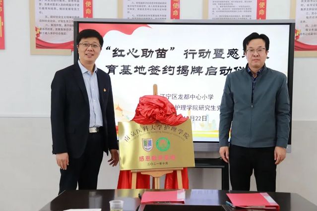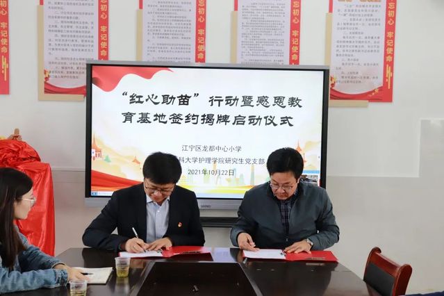 2021年7月,南医大党委党史学习教育领导小组办公室印发《关于开展南京医科大学“千村万户健康行”“红心助苗”行动的通知》南医大学办〔2021〕23号,要求通过积极开展与农村中小学党支部开展结对共建活动,扎实推进党史学习教育,把“学党史、悟思想、办实事、开新局”贯穿党史学习教育全过程,充分发挥医科大学服务社会的职能。我院党总支高度重视此项工作,由党总支书记陈龙牵头,研究生党支部组织落实,与龙都中心小学达成共建共识,成功开展启动仪式,签署感恩教育基地建设协议并揭牌。
