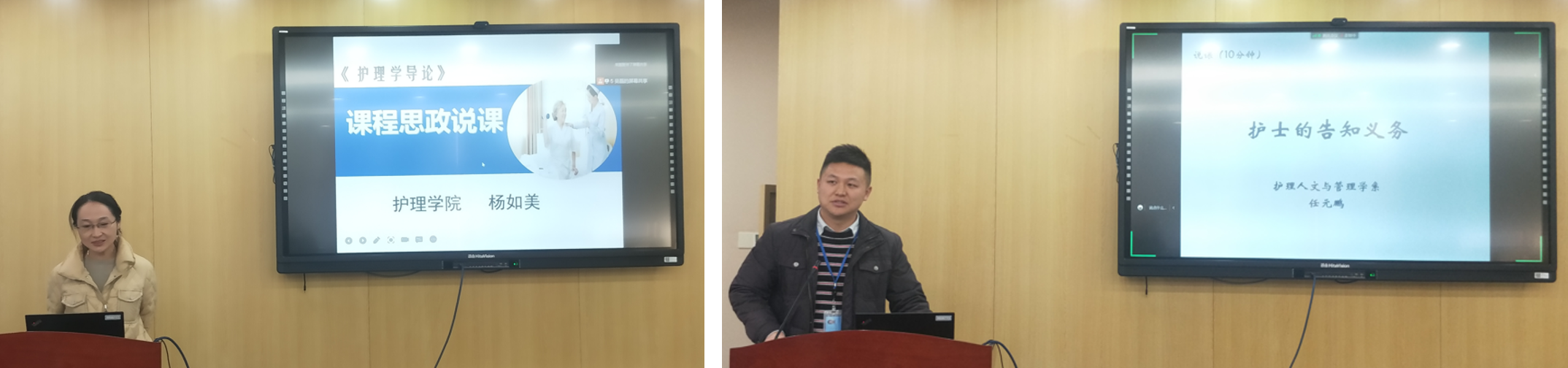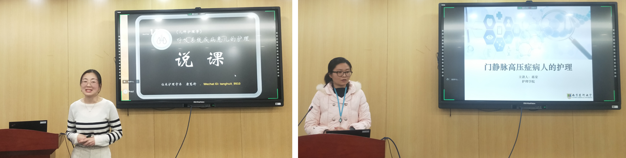 六位教师先后进行10分钟说课和6分钟现场讲课。杨如美老师主讲“奥瑞姆自理理论”,任元鹏老师主讲“护士的告知义务”,季明辉老师主讲“筛检与诊断试验的评价”,单恩芳老师主讲“生命历程中的身心发展”,唐慧婷老师“呼吸系统疾病患儿的护理”,蒋荣老师主讲“肝脏疾病病人的护理、门静脉高压症病人的护理”。