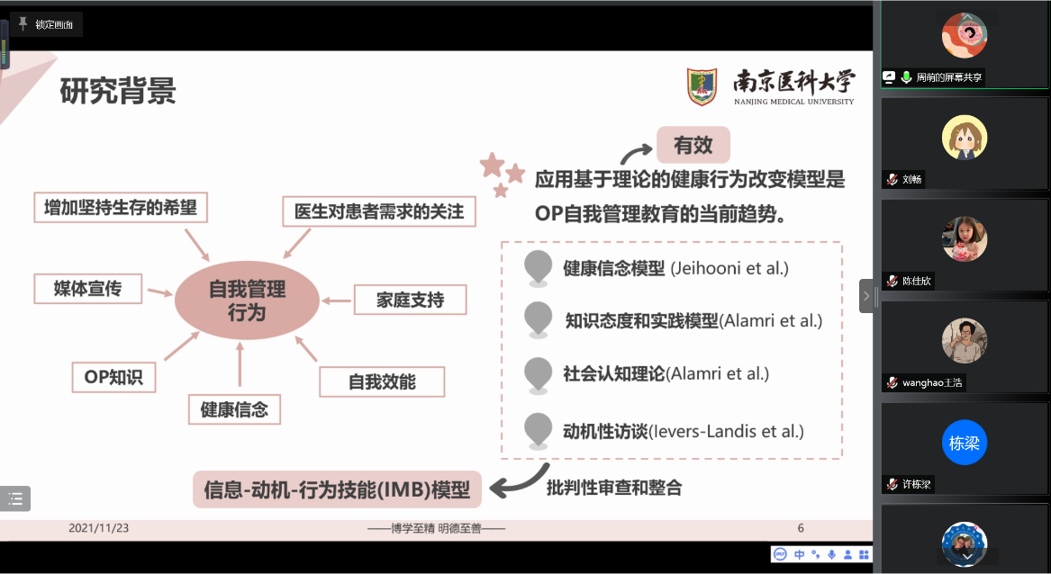 自2021年9月秋季学期以来,护理人文与管理学系开展了每两周一次的研究生读书报告会活动。MK体育(中国)林征教授、顾则娟教授、嵇艳副教授、杨如美副教授,医政学院钱东福院长、陆方副教授,公共卫生学院尤华副教授及学院年轻教师孟瑶、李莎等均参与其中并做指导。