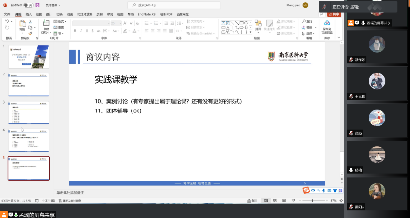 为了下学期《护理心理学》课程的顺利开展,发挥课程育人和心理育人协同效应,护理心理学备课组于12月24号在网络平台开展了集体备课会,对该课程理论和实践课进行集中讨论,重点对课时分配、留学生课程团队建设、案例讨论等内容进行了研讨。一附院王雪梅老师、脑科医院高颖老师,学院嵇艳老师、孟瑶老师、雷阳老师以及助教聂作婷参加了本次会议。