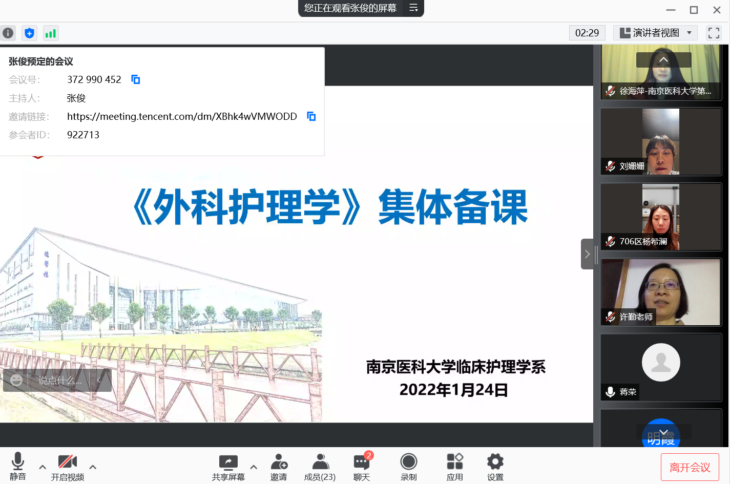 为进一步推进《外科护理学》课程建设改革,逐步提升课程改革成效,2022年1月24日晚上19:30分,mk体育在线官网临床护理学系线上开展了《外科护理学》课程新学期集体备课。