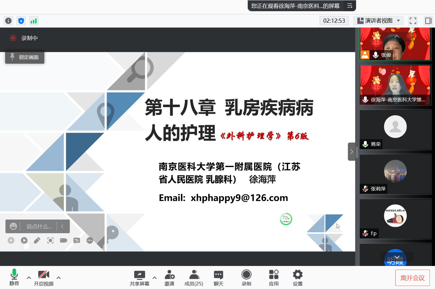 本次活动由《外科护理学》课程负责人张俊老师主持;MK体育(中国)许勤院长、丁亚萍副院长、临床护理学系朱姝芹老师、蒋荣老师以及来自南京医科大学第一附属医院、南京医科大学第二附属医院、南京医科大学附属南京医院、南京医科大学附属逸夫医院等多家医院的临床授课老师参加了本次活动。