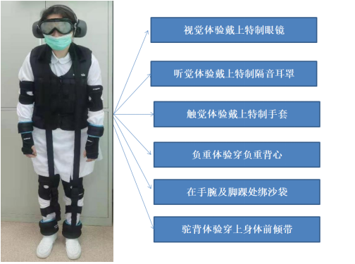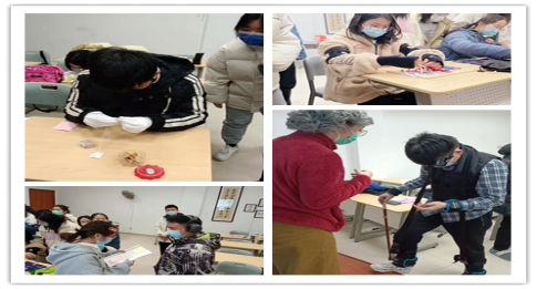 万老师和助教们指导学生们穿上特制老年人模拟体验服,降低视力、听力,限制腿部和手部的活动能力,拄起拐杖等,大家很快进入“老奶奶”、“老爷爷”的角色,模拟体验老年人完成行走、上下楼梯、夹取食物、品尝食物、穿针引线、与人沟通交流等老年人日常活动项目,从视觉、听觉、触觉、身体感觉等方面来体验老年人身体各器官功能的老化改变,感受老年人的日常生活状态。