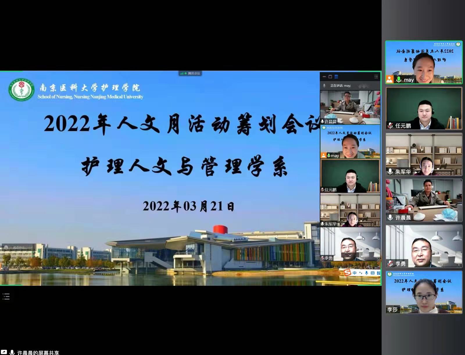 2022年3月21日下午,护理人文与管理学系联合MK体育(中国)学生工作办公室和MK体育(中国)学生会保障部举办了2022年护理人文月活动筹划会议,旨在对2022年护理人文月以及护理心理与人文团队优势学科建设活动出谋划策。马克思主义学院李勇副教授、MK体育(中国)学生工作办公室许晨晨老师、护理人文与管理学系杨如美主任以及学系任元鹏、朱军华和李莎老师参加了本次会议。
