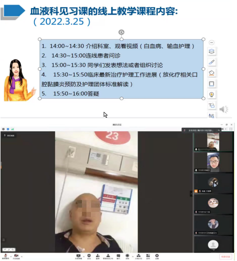 在血液科张飞彦老师和魏兴玲老师的课上,同学们观看视频(白血病、输血护理)、视频连线患者问诊、轮流总结并进行讨论,教师还介绍了放化疗相关口腔黏膜预防级护理的团体标准。通过视频连线患者问诊的创新举措锻炼了同学们的护患沟通能力,帮助同学们有效掌握理论教学内容,保障了见习课的教学效果。