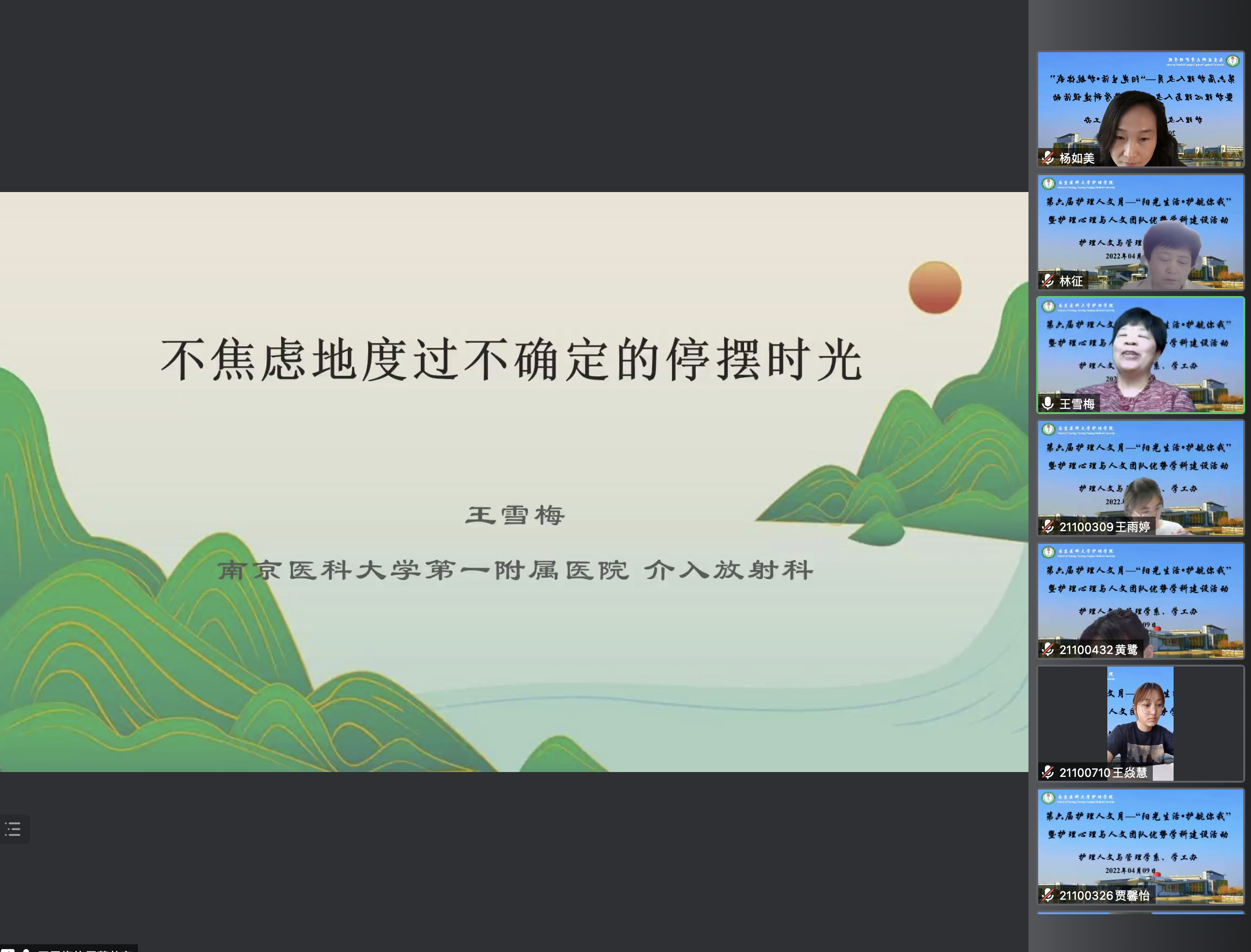2022年4月9日下午,护理人文与管理学系联合学生工作办公室举办的第六届护理人文月——“阳光生活·护航你我”暨护理心理与人文团队优势学科建设活动之“调整自我心理健康服务活动”圆满结束。本次活动邀请到了国家二级心理咨询师、南京医科大学第一附属医院介入放射科专科护士长王雪梅老师作为主讲嘉宾,MK体育(中国)林征教授主持了本次活动,护理人文与管理学系系主任杨如美副教授、李莎老师、护理心理与人文团队、MK体育(中国)学工办、MK体育(中国)本科生、留学生及研究生参加了本次活动。