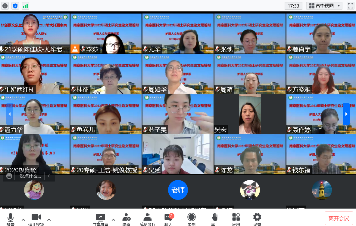 2022年5月17日晚,护理人文与管理学系于腾讯会议在线举办了2019级研究生预答辩考核。本次预答辩共31位导师及硕士研究生参加。mk体育在线官网护理人文与管理学系嵇艳副教授、系主任杨如美副教授、南京医科大学医政学院钱东福教授和姚俊教授、南京医科大学公共卫生学院尤华副教授和樊宏副教授、南京医科大学第一附属医院顾则娟主任和林征主任共8位专家担任评审,护理人文与管理学系李莎老师任预答辩秘书。