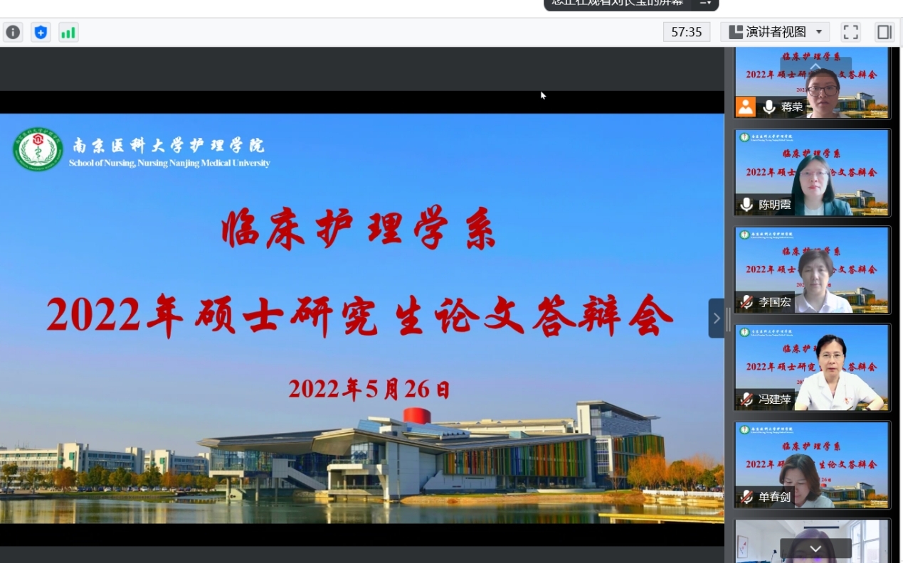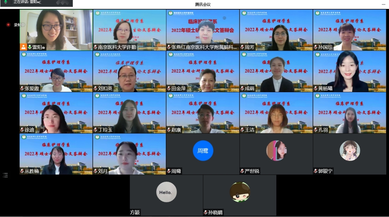 2022年05月26日下午,临床护理学系在线上举行了2022年研究生硕士论文答辩会。本次论文答辩会共18位硕士研究生参加,分为2个答辩组。东南大学附属中大医院原护理部李国宏主任、徐州医科大学MK体育(中国)副院长周芳教授任答辩主席,许勤教授、林征教授、孙国珍教授、顾平副教授、季晨博副教授、洪琴副教授、陈明霞副教授、刘扣英副教授、冯建萍主任护师、单春剑主任护师、张燕红主任护师、张爱霞主任护师、田金萍主任护师、程芳副主任护师任答辩委员,雷阳老师、蒋荣老师任答辩秘书。