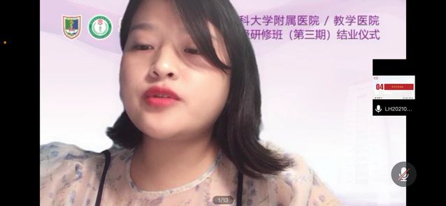 南京医科大学附属老年医院胡婷婷作为学员代表进行发言。她代表即将毕业的2021级全体研修班学员向辛勤授课的各位老师表示最衷心的感谢和最崇高的敬意,一年的研修班学习时光转瞬即逝,老师们用实事求是、一丝不苟的科学态度,勇于创新、求真务实的态度学术精神深深地影响着学员们。学员们将做到知行合一、学以致用,心系国家、心系学校,在未来一定有担当有作为,在实现中国梦伟大实践中创造自己的出彩人生。