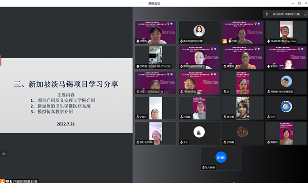 在新加坡淡马锡项目学习分享环节,朱军华老师向各位老师介绍了项目和义安理工学院的概况;李新香老师详细介绍了新加坡卫生保健医疗系统;汪璐老师分享了项目学习中的模拟仿真教学的相关内容。