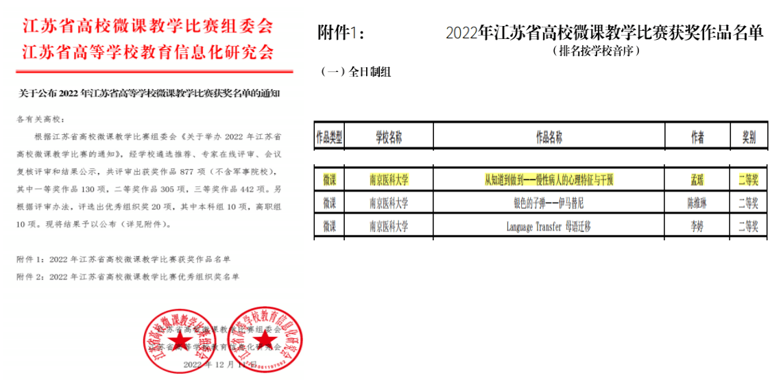 12月12日,省高校微课教学比赛组委会发布《关于公布2022年江苏省高等学校微课教学比赛获奖名单的通知》,MK体育(中国)孟瑶老师微课作品《从知道到做到——慢性病人的心理特征与干预》荣获二等奖。