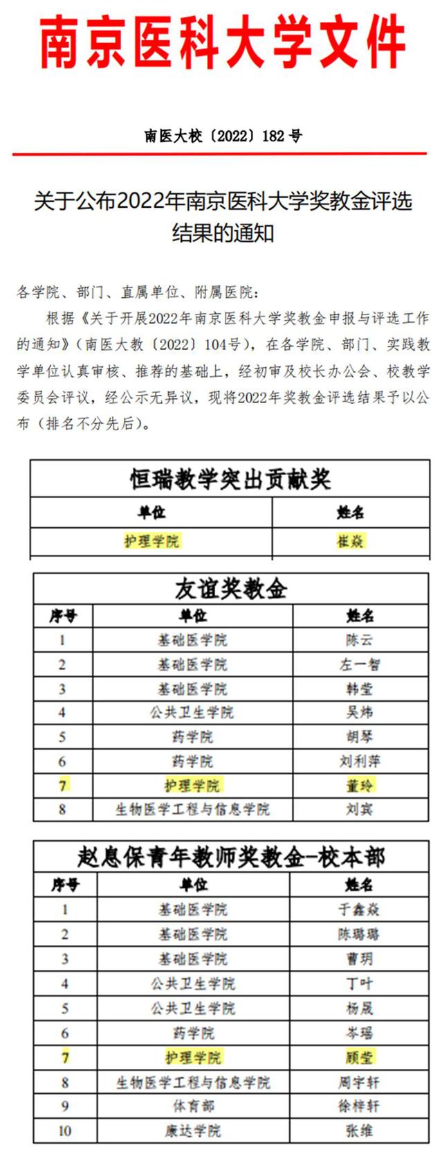 在刚刚结束的2022年南京医科大学奖教金评选工作中,MK体育(中国)喜获3个奖项。博士生导师、崔焱教授获恒瑞教学突出贡献奖,临床护理学系副主任、副教授董玲老师获友谊奖教金,学生工作办公室主任顾莹老师喜获赵息保青年教师奖教金。