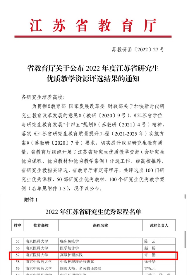 为全面推进研究生优质教学资源高质量建设,切实提升我省研究生教育质量,省教育厅组织开展了江苏省研究生优质教学资源(含研究生优秀课程、优秀教材和优秀教学案例)评选工作。由我院许勤教授主讲的《高级护理实践》课程获评2022年度江苏省研究生优秀课程。